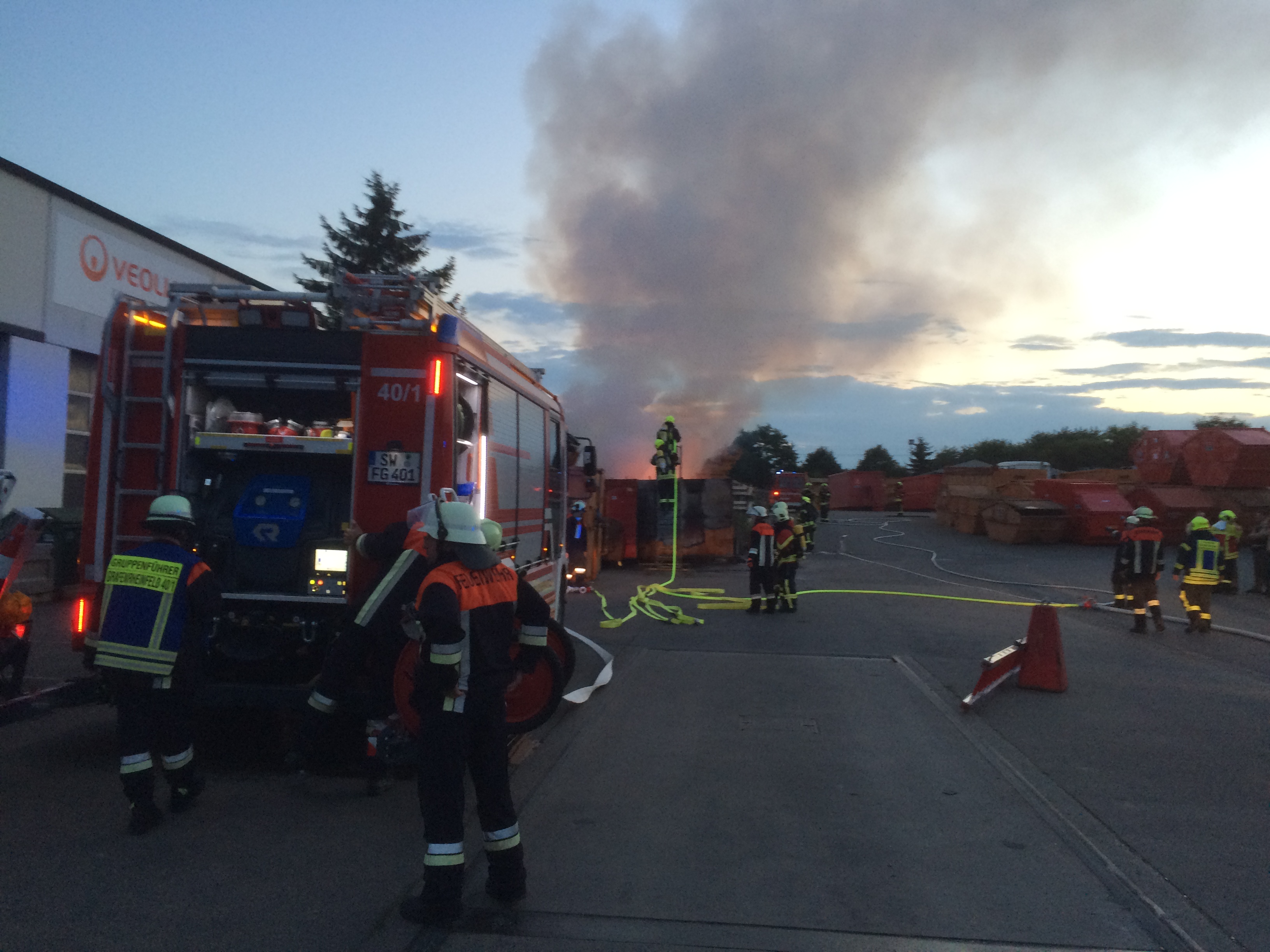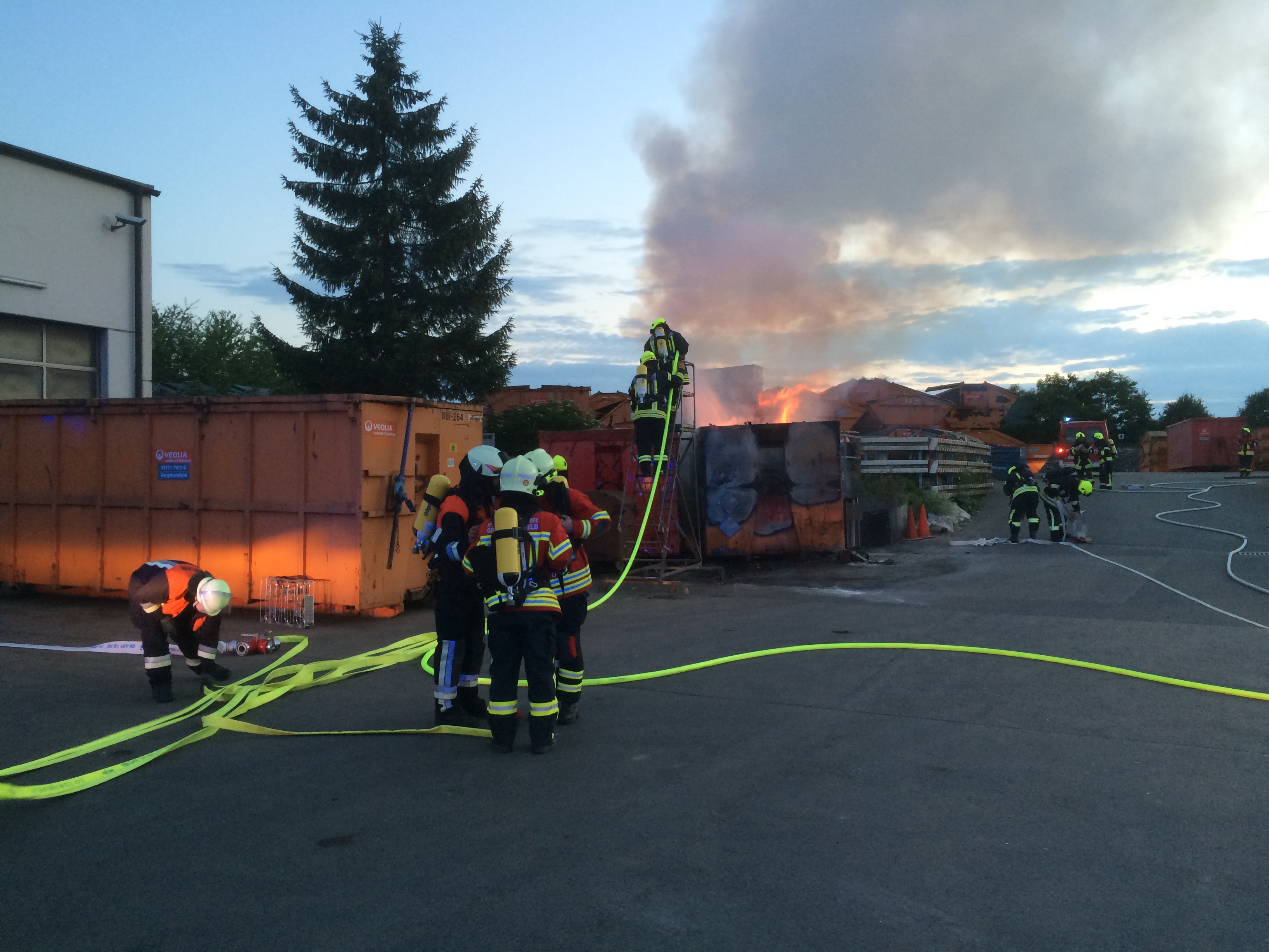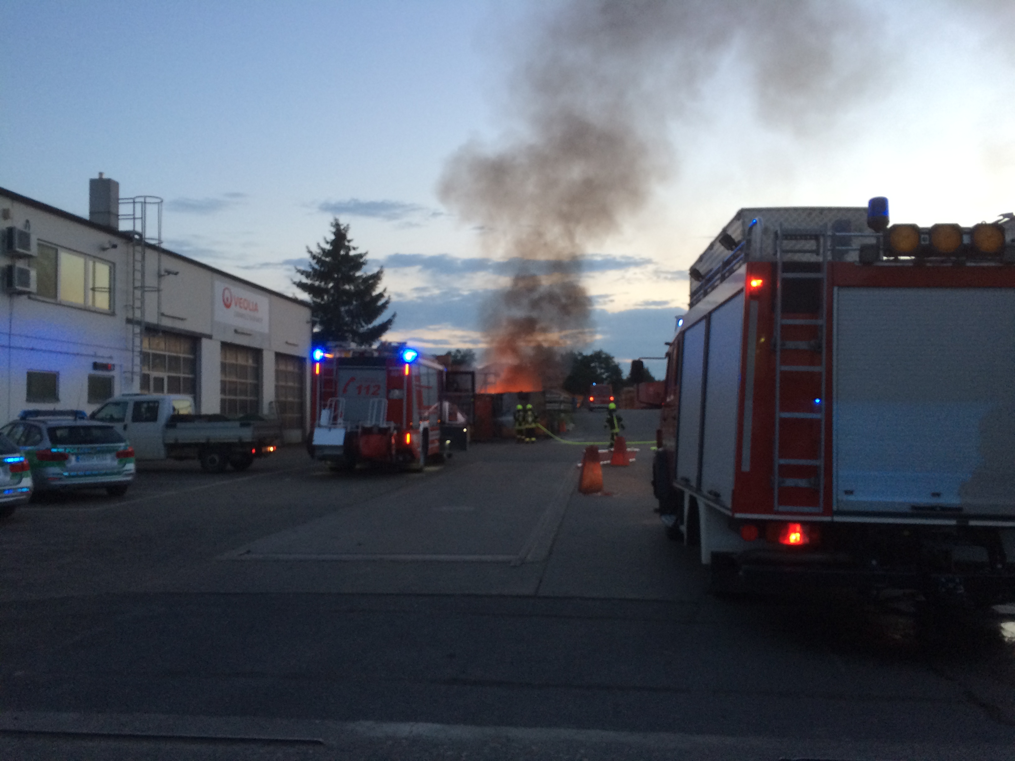 Bei Eintreffen der Feuerwehr stand ein Container bereits im Vollbrand. Das Feuer griff zudem bereits an einem daneben stehenden Container über.